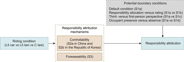 图1. 涉及L5 AV事故的责任归属的理论框架。研究1(S1)、研究2(S2)和研究3(S3)表明了测试特定条件或心理机制的实验研究。研究1a的默认 条件是,参试者从第三人称角度将固定数量的责任分配给车内乘员和其他责任代理人(责任分配×第三人称视角×乘客在车内)。C taxi:传统出租车?