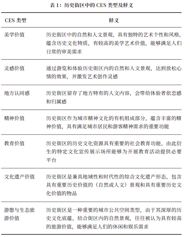 2005年,千年生态系统评估将CES定义为人类通过精神满足、认知能力的发展、反思、娱乐及审美体验等从生态系统中所获取的非物质收益。在此框架下,本研究整理了与历史街区的体验、感知、资源或价值等相关的研究,得到历史街区背景下各类CES的具体释义。