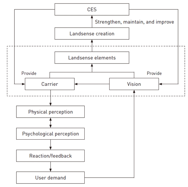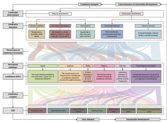 人类对生态系统的非物质精神需求和生态系统提供的景感要素特征,是CES从生态系统流向人类社会系统的动态过程的两个主导元素。下图简要展示了在景感生态学的背景下景观感知的结构和过程,厘清了景观感知通过景感营造方法影响CES的逻辑。