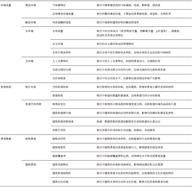 本文将景感要素定义为承载使用者的需求愿景,并能够影响使用者感知的自然或人工环境中的要素。本研究将历史街区的景观环境分为自然和人文两个类别,并从中总结出五个主要的景感要素类型及多个子类型:自然环境景感要素包括气候条件(温度、湿度、风速等)和环境质量(大气环境、视觉环境、声环境、嗅觉环境、水环境、光环境等),人文环境景感要素包括街巷格局(街区布局、街道空间界面等)、景观要素(植物景观、建筑景观、水体景观等)和文化要素(文化遗产、文化设施、文化经济等)。