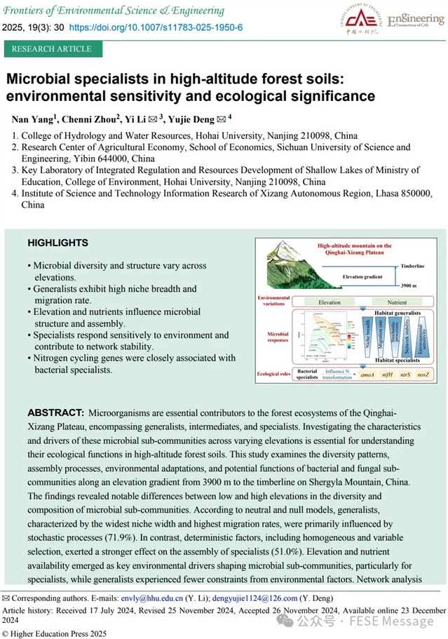 本文内容来自FESE期刊2025年第19卷第3期发表的研究文章“Microbial specialists in high-altitude forest soils: environmental sensitivity and ecological significance”。通讯作者为河海大学的李轶教授。