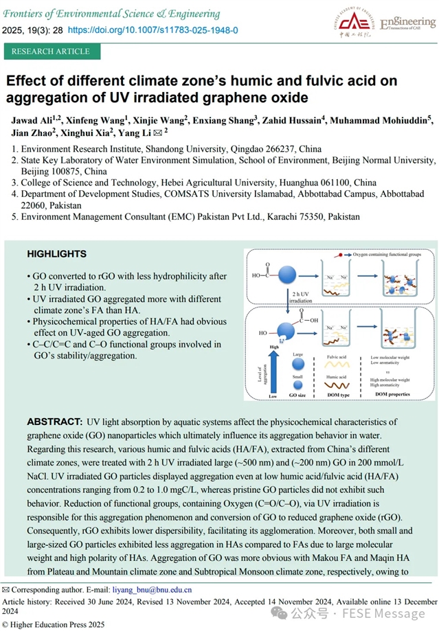 本文内容来自FESE期刊2025年第19卷第3期发表的研究文章“Effect of different climate zone’s humic and fulvic acid on aggregation of UV irradiated graphene oxide”。通讯作者为北京师范大学的李阳教授。