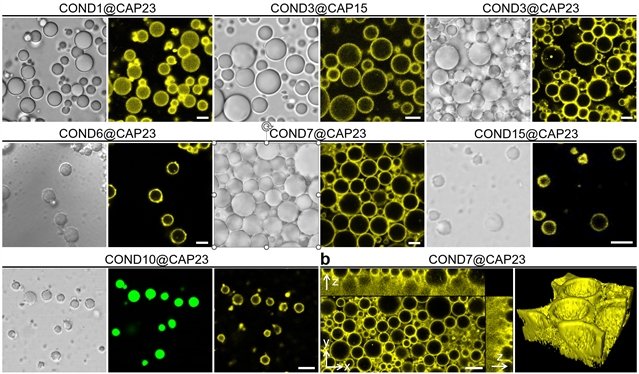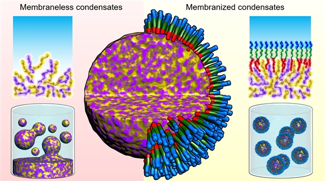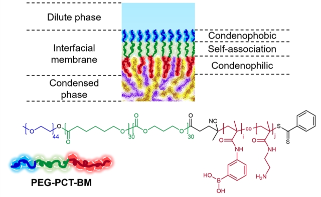 该成果报道了一类可通用地稳定各种“凝聚相-水相”界面的新型嵌段高分子(Condensate-Amphiphilic block Polymers, CAPs),实现了对合成或生物凝聚液滴的超强稳定和自发乳化能力。
