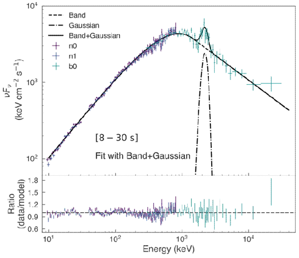 伽马暴是宇宙中最剧烈的伽马射线爆发现象。尽管迄今为止已取得较多进展,但伽马暴的起源和辐射机制仍存在较多未解之谜。例如,伽马暴的前身星是什么?产生伽马射线的辐射过程是什么?伽马暴谱线探测对研究其物理机制非常重要,能够为揭示伽马暴的中心引擎、喷流结构和辐射过程等提供线索。而在伽马暴能谱中,探测X射线或伽马射线谱线的进展相对缓慢,仅在GRB 221009A中发现了一条显著性超过5σ、能量约10 MeV的窄发射线。这是伽马暴研究史上首次在MeV能段发现谱线存在的证据,但该MeV发射线的物理起源尚不清楚。