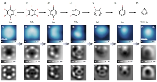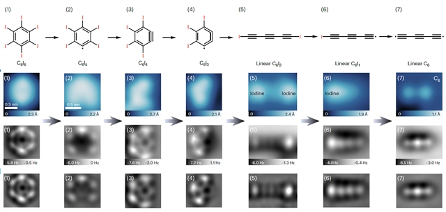 研究团队创新性地采用全卤代苯(C6I6)作为前体分子,在液氦冷却的4.7K超低温环境下,将分子"冻结"于氯化钠薄膜表面。利用扫描隧道显微镜针尖的原子级操控技术实现精准脱卤反应,通过调控基底耦合效应,在单层NaCl表面成功制备了线型碳C6,并在双层NaCl表面突破性地获得了环型碳C6。原子力显微镜的化学键分辨成像技术首次清晰揭示了两种同分异构体的结构特征,即线型碳C6呈现单三键交替的聚炔型,环型碳C6呈现连续双键的累积烯烃型。以上结果为分子碳材料基础理论研究提供了直接实验证据。