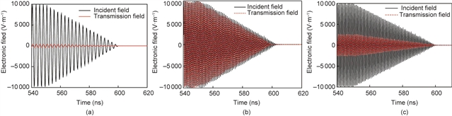 文章指出,根据大功率微波的发展现状,超宽频高功率微波的频谱主要集中在0.15~5 GHz的范围内,未来可能会发展出更高的频率。因此,在研究超宽谱高功率微波的带外滤波特性时,以三种典型的时域波形为例,选取τ的值分别为4 × 10−9、4 × 10−10和4 × 10−11。在这种情况下,当τ = 4 × 10−9和τ = 4 × 10−10时,脉冲频谱覆盖5 GHz以下的频带,这对应于超宽谱高功率微波的频率范围。当τ = 4 × 10−11时,脉冲频谱高达60 GHz,可以代表未来超宽谱高功率微波的发展趋势。虽然频谱较宽,技术上难以实现,而且覆盖了天线罩的工作频带,但对其滤波特性进行理论讨论有利于提高综合性能。结果表明,天线罩对各种波形的超宽谱大功率微波具有较强的衰减抑制作用。入射波的频率越低,衰减就越强。即使超宽谱高功率微波频谱覆盖了天线罩的通带,它仍然具有大约15 dB的峰值衰减。总之,该天线罩对超宽谱高能电磁脉冲具有良好的带外滤波特性。