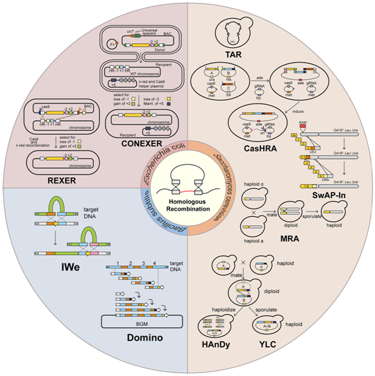 过去20年间,DNA合成与组装技术取得了飞速进展,产生了适用于不同规模的多种组装技术。相较于体外组装技术存在的工作量大及长度限制等问题,基于同源重组的体内组装成为了构建大片段DNA的主要手段。目前,体内组装主要依赖于三种模式生物底盘:大肠杆菌、枯草芽孢杆菌以及酿酒酵母。本文作者基于这三种常用的底盘生物,总结了目前大片段DNA组装的前沿策略(图1)。