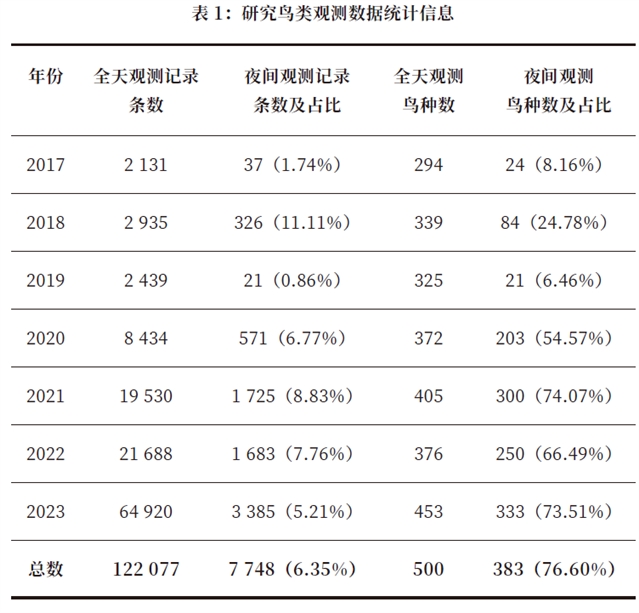 夜间一般指从黄昏到黎明,太阳低于地平线的时段(即太阳方位角-6°以下)。本研究中的“夜间”指18:00到次日06:00,覆盖了大部分鸟类活动较为频繁的晨昏时段,且与城市夜间开启照明的时段基本相同。