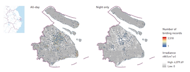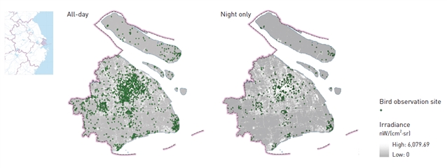 本研究创新性地结合夜间人工照明遥感数据和公民科学家数据,以上海市城区为例,探究夜间人工照明水平与鸟类栖息活动的关系,以助力城市暗夜友好环境建设。