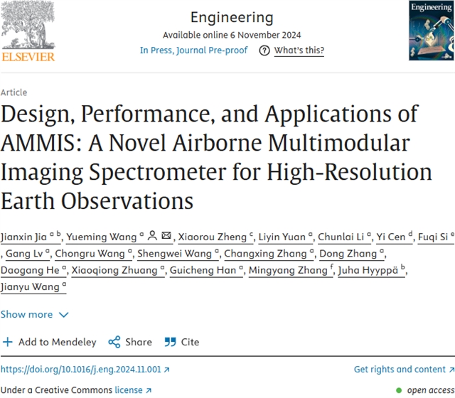 Jianxin Jia, Yueming Wang, Xiaorou Zheng, Liyin Yuan, Chunlai Li, Yi Cen, Fuqi Si, Gang Lv, Chongru Wang, Shengwei Wang, Changxing Zhang, Dong Zhang, Daogang He, Xiaoqiong Zhuang, Guicheng Han, Mingyang Zhang, Juha Hyyppä, Jianyu Wang. Design, Performance, and Applications of AMMIS: A Novel Airborne Multi-Modular Imaging Spectrometer for High-Resolution Earth Observations. Engineering.