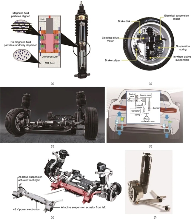 图1. 商用车所采用的最先进的主动悬架系统机电一体化解决方案。(a)凯迪拉克MagneRide,典型的半主动悬架系统;(b)米其林车轮主动悬架;(c)梅赛德斯-奔驰AIRMATIC悬架;(d)梅赛德斯-奔驰ABC,一种电动液压悬架;(e)奥迪A8预测主动悬架,配备旋转电动执行器(红色突出显示),空气悬架,道路预览摄像头;(f)博士电磁主动悬架。AI:人工智能。