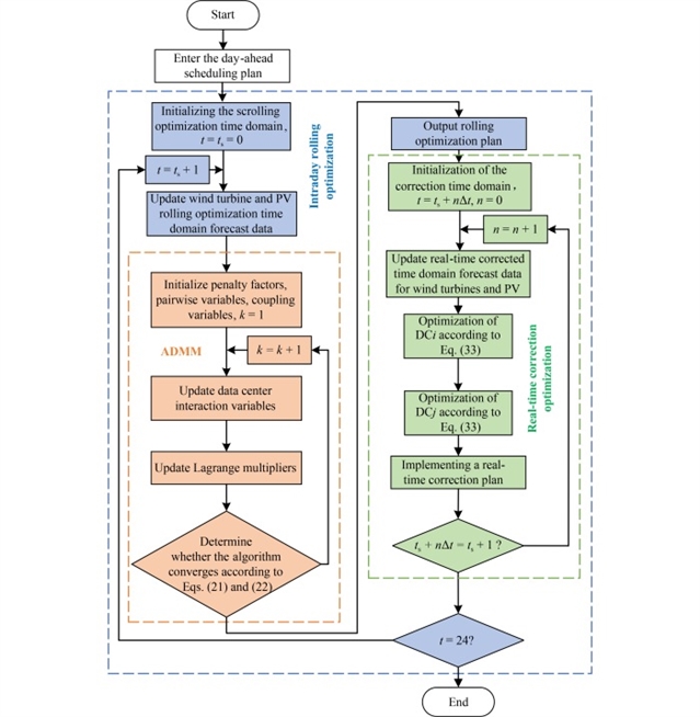 以三个互联数据中心为例,设置不同场景对比分析。结果表明,多时间尺度优化调度模型相较于传统方法,经济成本降低19.6%,电网功率波动减少15.23%。日内滚动优化利用源荷侧灵活性资源,实时校正能适应可再生能源输出的小尺度波动,ADMM可有效求解模型,且计算量小、信息交互少。