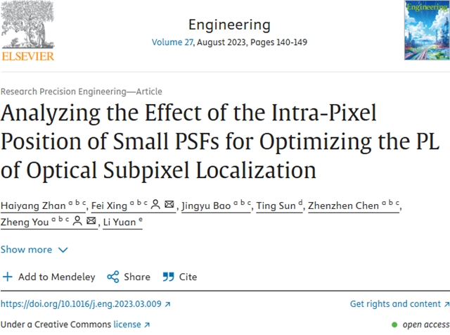 清华大学尤政院士、邢飞教授团队在中国工程院院刊《Engineering》发表了题为“Analyzing the Effect of the Intra-Pixel Position of Small PSFs for Optimizing the PL of Optical Subpixel Localization”(优化光学亚像素定位精度极限——揭示小PSF的像素相位效应)的研究性文章,提出了一种用以揭示小PSF像素相位效应的定位精度极限分析方法。为准确估计实际应用中的定位精度极限,文章首先提供目标有效点扩散函数(ePSF)建模方法,并应用克拉美罗下界(CRLB)理论。基于小PSF的特性,推导了揭示任意非理想小PSF的最优精度极限和最佳像素相位的简化公式,并在真实PSF上验证了其有效性与准确性。其次,文章使用典型高斯PSF作进一步推导,揭示了最优定位精度极限在PSF高斯半径尽可能小且位于像素边缘时实现,这表明最优定位精度极限最终受限于光的衍射极限。最后,文章利用最大似然估计(MLE)方法拟合ePSF模型,使真实PSF的定位精度达到理论精度极限。