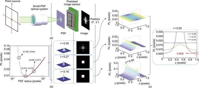 图1. 小PSF像素相位对定位精度极限的影响。(a)点源的光学成像和亚像素定位过程,即根据像素响应估计PSF在像素化图像探测器上的位置(x*,y*)。(b)忽略PSF的像素相位,估计x*时的平均精度极限与高斯半径之间的关系。三个不同PSF半径及其精度极限结果标记在曲线上,三个PSF及其成像显示在右侧。精度极限计算细节如下:假设PSF为二维高斯函数,探测到的光子数为1500,添加与实际应用相仿的典型噪声。在这种情况下,半径为0.27像素的PSF达到了0.012像素的精度极限。(c)半径为0.50像素(顶部)、0.27像素(中心)和0.16像素(底部)的三个PSF在不同像素相位上的精度极限。在右侧比较了y = 0.50像素的横截面上三个PSF的精度极限曲线,其中,最小的PSF在像素边界处达到0.005像素的精度极限。PSF:点扩散函数;r:PSF的半径。