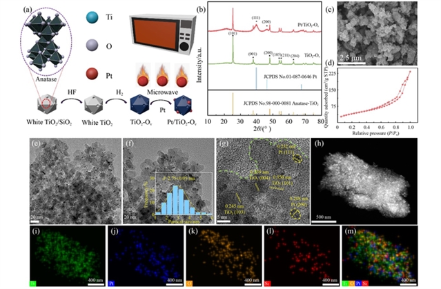 文章首先采用溶胶-凝胶法,将Ti(SO4)2和SiO2分别溶解、混合,经冰浴超声、调节pH、多次洗涤等步骤,再经过油浴加热、水热反应、真空干燥和高温热处理,得到TiO2-Ov。再通过不同浓度HF刻蚀TiO2/SiO2并进行高温氢退火,优化产量和比表面积,得到富含氧空位的TiO2-Ov。最后将TiO2-Ov分散在乙二醇中,依次加入NaOH溶液、H2PtCl6·6H2O等,经搅拌、超声、微波合成等操作,再洗涤、干燥,制得Pt/TiO2-Ov催化剂。