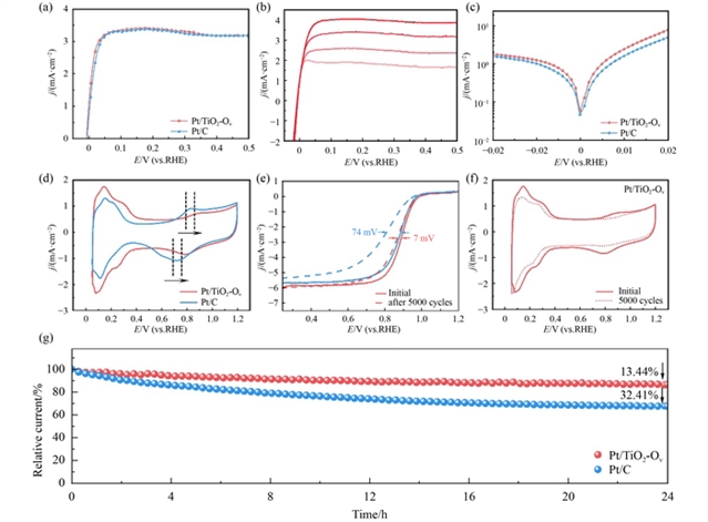 论文标题:Bifunctional Pt/TiO2-Ovcatalysts for enhanced electron transfer and CO tolerance in acidic HOR and ORR