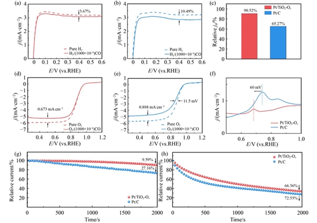 CO poisoning; hydrogen oxidation reaction; oxygen reduction reaction; proton exchange membrane fuel cells (PEMFCs); Pt/TiO2 catalyst
