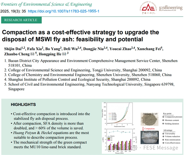 本文内容来自FESE期刊2025年第19卷第3期发表的研究文章“Compaction as a cost-effective strategy to upgrade the disposal of MSWI fly ash: feasibility and potential”。通讯作者为南洋理工大学的Zhanbo Cheng博士和深圳大学的何宏平副研究员。