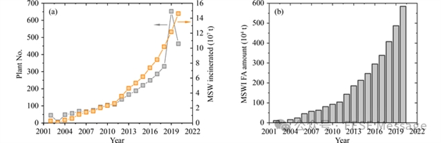 随着城市化进程的加快推进,城市生活垃圾产量持续增长。作为一种能够显著减少垃圾体积和重量的处理方式,垃圾焚烧技术在我国得到广泛应用。2001年,我国仅有45座垃圾焚烧厂,处理垃圾量为275万吨;到2020年,焚烧厂数量激已增至463座,处理量高达1.46亿吨。然而,垃圾焚烧产生的飞灰含有毒有机物、重金属和高浓度氯化物等有害成分,属于危险废物。目前,稳定化/固化后填埋是飞灰的主要处理方式,但稳定化飞灰仍存在粒径细、密度低、孔隙多的问题,不仅增加填埋难度,还在运输等环节存在潜在的环境风险。