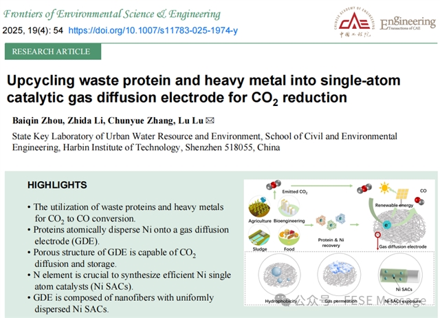 本文内容来自FESE期刊2025年第19卷第4期发表的研究文章“Upcycling waste protein and heavy metal into single-atom catalytic gas diffusion electrode for CO2reduction”。通讯作者为哈尔滨工业大学的路璐教授。