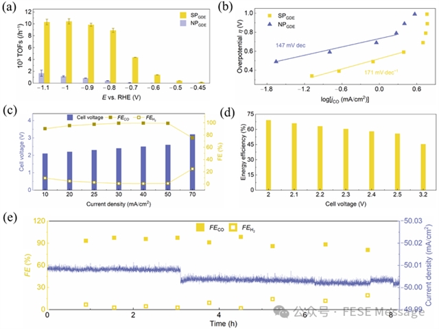 在单室电解池中,SPGDE在−0.8 V(vs. RHE)下CO法拉第效率(FE)达96%,且宽电位范围内FECO始终高于80%。而在膜电极组件(MEA)中,SPGDE在50 mA/cm2电流密度下保持FECO在90%以上的选择性,能量效率超过50%。此外,SPGDE在连续运行8小时后性能未显著衰减,结构稳定性优于传统催化剂(图4)。