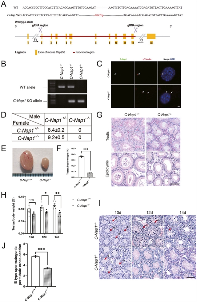 通过测量两组小鼠在出生后不同时间的睾丸与体重比,发现12天时睾丸开始显示出统计学上的显著差异,但在12天之前没有统计学差异。睾丸组织学显示,C-Nap1−/−小鼠在出生后10天的精母细胞和精原细胞数量少于WT小鼠;此外,在12天和14天时,精母细胞和精原细胞数量也少于WT小鼠(图H, I, J),这表明C-Nap1缺失直接导致了无精症。