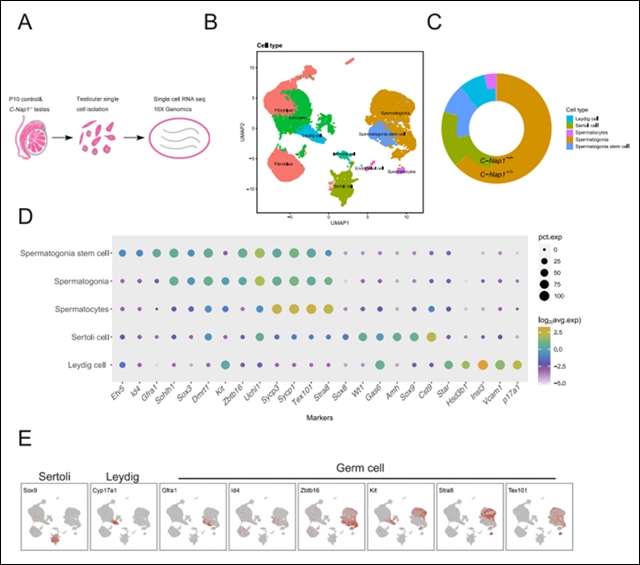 通过UMAP聚类分析,研究人员鉴定了九种主要细胞类型,包括精原细胞、支持细胞、精原干细胞、间质细胞和精母细胞等(图2B)。在C-Nap1敲除小鼠中,精原细胞比例显著降低,精母细胞几乎消失。这一细胞比例的失衡,严重破坏了睾丸内正常的细胞生态,影响精子发育的微环境,从细胞层面揭示了精子发育受阻的原因。