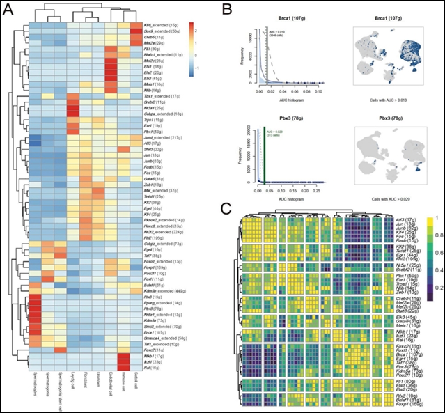 图 3. SCENIC转录组分析。A图展示不同基因标记在9种细胞类型中的表达水平聚类;B图结合AUC直方图和空间表达图展示Brca1和Pbx3的分布;C图为多参数热图。