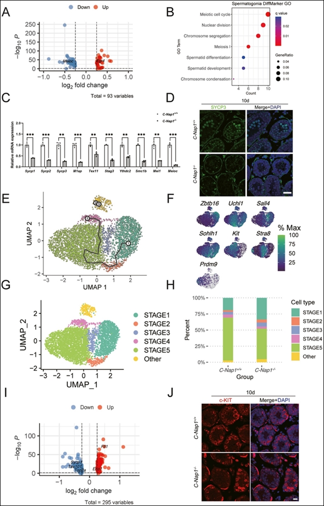 图 4.C-Nap1基因敲除导致小鼠精子发生的基因表达模式改变。A图为火山图展示差异表达基因;B图是基因本体术语与精原细胞差异标记图;C图为定量 RT-PCR 检测减数分裂特异性基因的 mRNA 表达;D图为免疫荧光分析减数分裂特异性标记 SYCP3;E图为结合伪时间排序和 UMAP 聚类的分析;F图展示了不同精原细胞状态下标记基因的表达模式;G图为精原细胞发育状态的 UMAP 图;H图为各精原细胞发育状态在不同基因型小鼠中的比例;I图为 STAGE5 中差异表达基因的火山图;J图为免疫荧光分析分化的精原细胞标记 c-KIT。