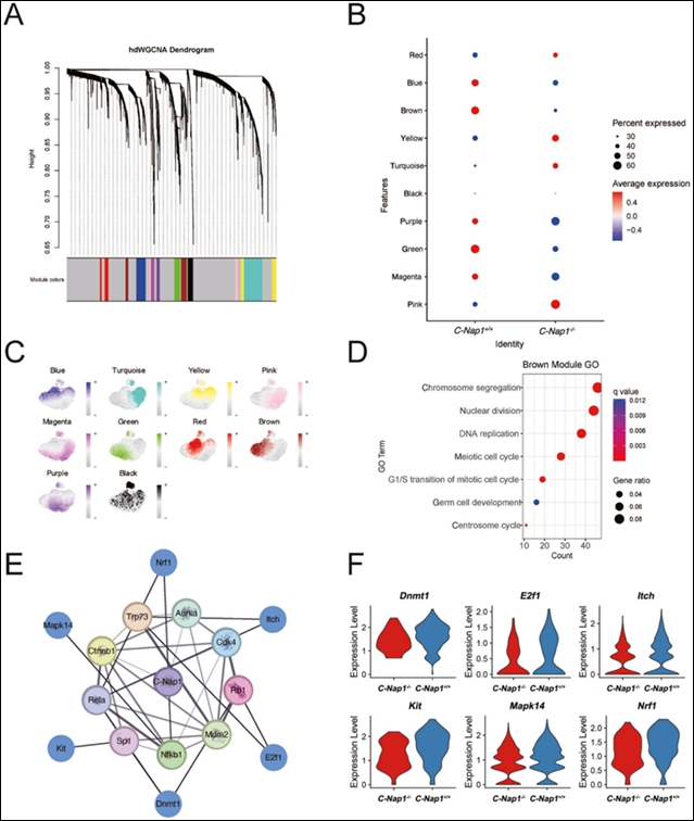 为了探索与C-Nap1相关的基因在精子发生中的作用,研究团队采用高维加权基因共表达网络分析(hdWGCNA)对精原细胞进行进一步分析,获得了总共10个模块(图5A)。在评估每个模块在不同基因型和表达细胞类型中的表达水平后发现,棕色模块与精原细胞减少的细胞群体高度相关(图5B,C)。通过GO富集分析,棕色模块中的差异表达基因主要在与精子发生相关的功能术语中富集(图5D)。在比较模块后,假设棕色模块对应于图4G中的STAGE5。因此,使用STAGE5中的差异表达基因与棕色模块中的基因的交集作为代表KO小鼠表型效应的基因。