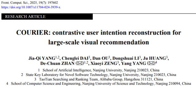 Jia-Qi YANG, Chenglei DAI, Dan OU, Dongshuai LI, Ju HUANG, De-Chuan ZHAN, Xiaoyi ZENG, Yang YANG. COURIER: contrastive user intention reconstruction for large-scale visual recommendation. Front. Comput. Sci., 2025, 19(7): 197602