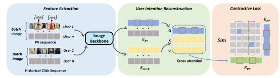 通过将数据组织成展示页面和用户历史点击的形式,可以使用注意力模块实现用户兴趣的重构,重构后的用户兴趣嵌入通过对比学习损失函数进行优化,使得点击样本的重构误差尽量小,未点击样本的重构误差较大,达到区分用户兴趣的目的。