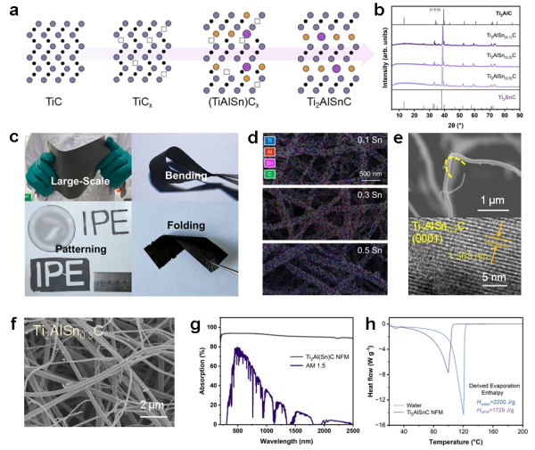 该研究引入具有金属与陶瓷双重特性的MAX相材料。MAX相是新型功能性陶瓷材料,兼具陶瓷的高硬度、耐高温、耐腐蚀以及金属的导电性、导热性和耐辐射性。研究通过调控A位元素(Sn/Al)固溶体,共型合成一维Ti2AlSnC纳米纤维膜。实验数据显示,该材料具备超90%的宽光谱吸收率和高效光热转换能力,展现出优异的化学稳定性与机械柔韧性,可在pH<1的强酸环境中连续运行30天,保持2.8 kg m-2h-1的稳定蒸发速率。