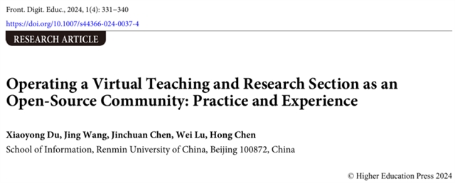 近日,中国人民大学杜小勇教授等在Frontiers of Digital Education(《数字教育前沿(英文)》)期刊上发表了一篇题为Operating a Virtual Teaching and Research Section as an Open-Source Community: Practice and Experience的文章,以数据库课程虚拟教研室为例,详细阐述了其建设过程、运营机制和取得的成果。