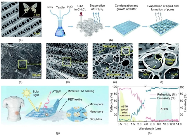 东华大学团队受丝带凤蝶单层翅膀独特光子结构的启发,利用微阵列技术,制备出辐射制冷纺织品(RCTs)。丝带凤蝶翅膀因其精细的分级多孔结构和固有材料特性,具备宽带太阳光反射和大气窗口散热能力。研究人员基于此,使用高大气窗口发射率材料构建了具有精细三级微 / 纳米架构的单层纺织品。