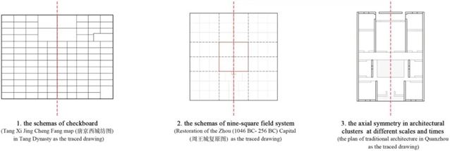 ▲ 图一:历史街区中棋盘格,井田制,轴对称的空间布局图式。©本文作者