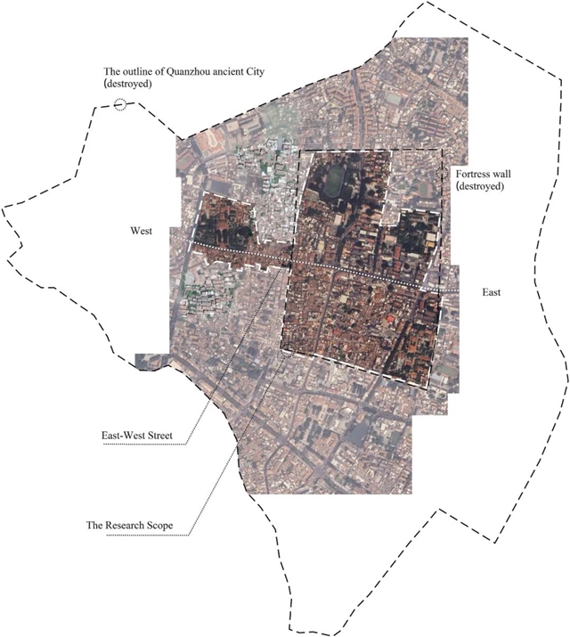 ▲ 图三:泉州古城东西街区的研究范围(白色虚线围合部分)。©本文作者