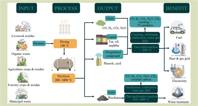 活化和气化:在高于600 °C的温度下进行,引入氧化剂释放剩余挥发分,开发多孔特性,显著增强生物炭的吸附和催化能力。