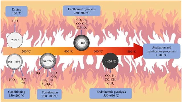 放热热解:发生在250 °C至500 °C之间,生物质多聚体结构分解,释放多种气态产物,生物炭产量达到最高。
