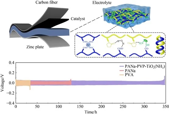 具有高能量密度和安全性的柔性水性锌-空气电池引起了人们的广泛关注。凝胶聚合物电解质因其具有防止电解质泄漏的能力而成为传统液体电解质的首选。在这项研究中,设计了一种具有高耐碱性和离子导电性的复合PANa-PVP-TiO2(NH2)水凝胶,其中无机TiO2(NH2)纳米粒子均匀分布并整合到聚丙烯酸钠和聚乙烯吡咯烷酮的有机双网络中。有机-无机杂化结构增强了电解质溶液的吸收和保持能力,使凝胶聚合物电解质在柔性水性锌-空气电池的整个运行过程中具有令人印象深刻的离子电导率。此外,TiO2(NH2)纳米粒子的掺入和双网络结构有效地增强了凝胶聚合物电解质的机械强度和柔韧性,抑制了副产物和锌枝晶的形成。这些改进增加了锌对称电池的循环寿命,以及柔性水性锌-空气电池的功率密度和循环使用寿命。