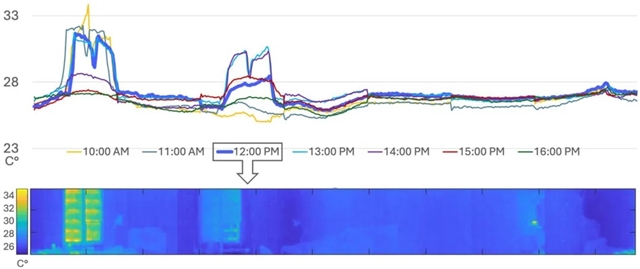 ▲ 图一:2-1房间平均表面温度的逐时变化情况(上图),以及于中午12点捕捉到的全景热成像可视化图(下图)。(该图像拍摄于加拿大魁北克市拉瓦尔大学建筑学院的 2-1 房间)。©本文作者