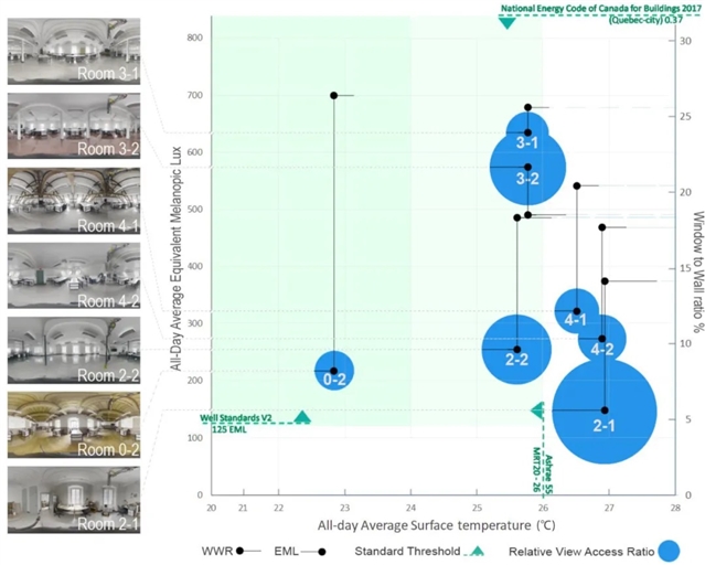 ▲ 图四:2021年7月不同日期上午10点拍摄的位于加拿大魁北克拉瓦尔大学建筑学院内四个不同室内空间中心点。对比了这四个不同空间中分布式表面温度的均匀性、M/P比例以及视野可达情况。©本文作者