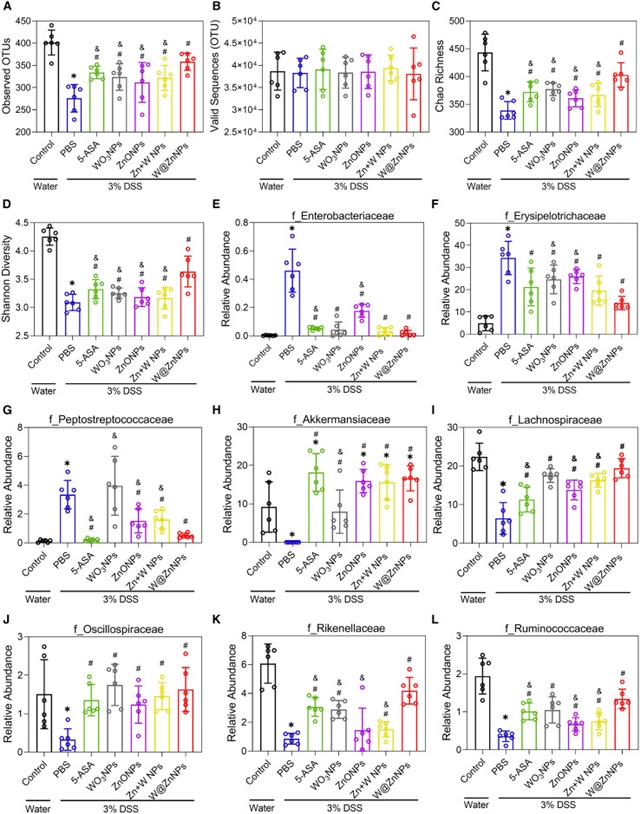 W@ZnNPs在胃酸环境中具有高稳定性,实现炎症肠段的靶向释放;其次利用表面特性增强黏液层粘附,促进与肠道菌群的局部相互作用;最后通过控制释放机制实现锌、钨的时空协同递送。动物实验显示,W@ZnNPs可显著增加潘氏细胞数量,恢复其溶菌酶等抗菌肽分泌功能;同时促进杯状细胞增殖,重建结构完整的粘液屏障。在微生物调控方面,钨组分展现出精准的抗菌谱调节能力。通过选择性抑制肠杆菌科等兼性厌氧菌的过度增殖,成功将结肠炎小鼠的菌群多样性指数恢复至健康水平。这种选择性调控避免了传统抗生素的广谱杀伤效应,为维持菌群稳态提供了新的思路。