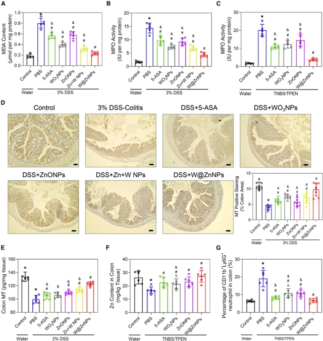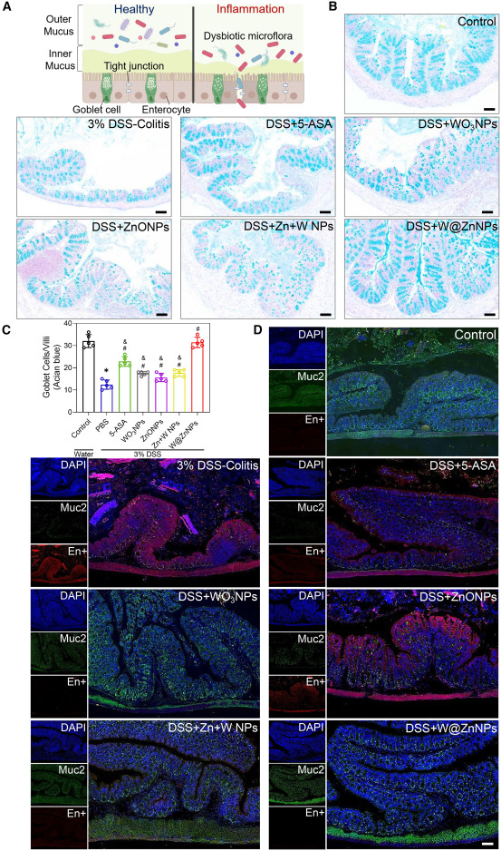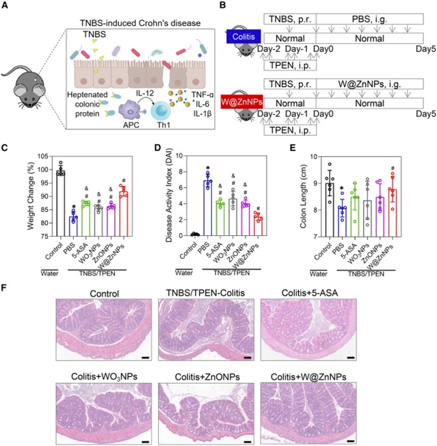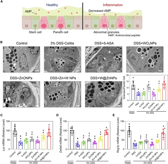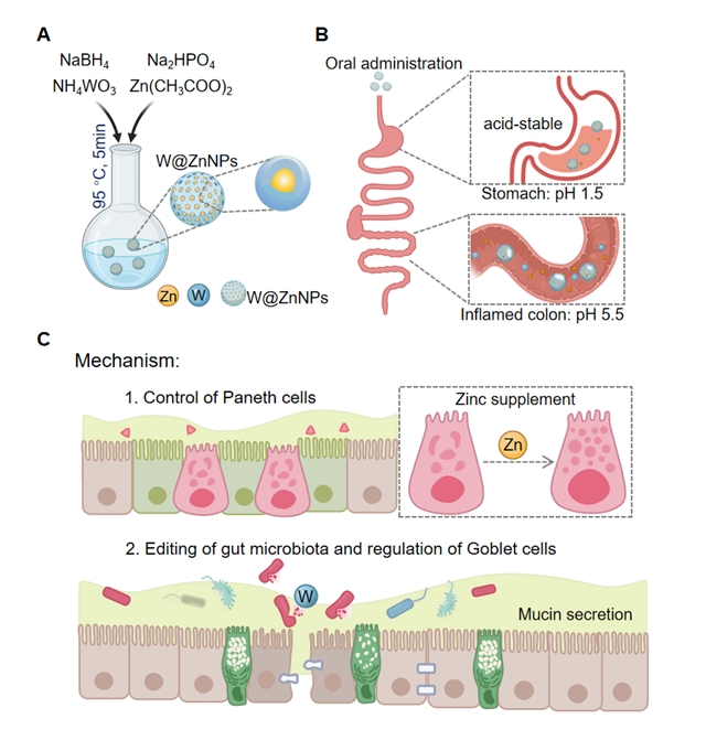 研究团队提出的创新疗法聚焦于肠道稳态的三大核心要素:潘氏细胞、杯状细胞和肠道菌群。潘氏细胞作为肠道免疫哨兵,通过分泌抗菌肽维持微生态平衡;杯状细胞构建的粘液屏障则是抵御病原入侵的首道防线。在IBD病程中,这两种细胞的数量和功能均出现受损,导致屏障破坏和菌群失调。基于此,研究团队设计了一种具有双重功能的金属纳米颗粒W@ZnNPs,巧妙整合锌对上皮细胞的关键作用与钨的微生物调控能力。