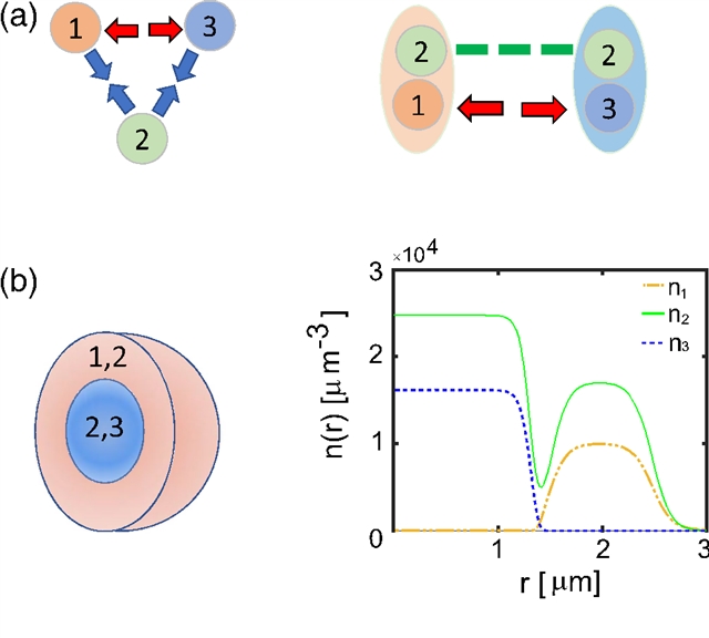 中国科学院物理研究所/北京凝聚态物理国家研究中心凝聚态理论与材料计算重点实验室崔晓玲研究员与博士后麻银峰(现入职海军工程大学)在构造壳层状量子液滴这一问题上取得了突破性进展。他们提出利用三组分的玻色体系(1,2,3),其中(1,2)和(2,3)两对各自形成量子液滴,而1-3之间极强的排斥作用使得两对液滴处于相分离状态,自然地形成了内核和壳层结构。同时,由于共同组分(2)的表面张力,为两个相分离的液滴搭建了链接的桥梁,从而整个体系呈现自束缚特征(图1)。通过对实际23Na-39K-41K 三组分玻色体系的Gross-Pitaevskii 方程数值模拟,这种稳定的壳层状自束缚液滴态被成功验证。