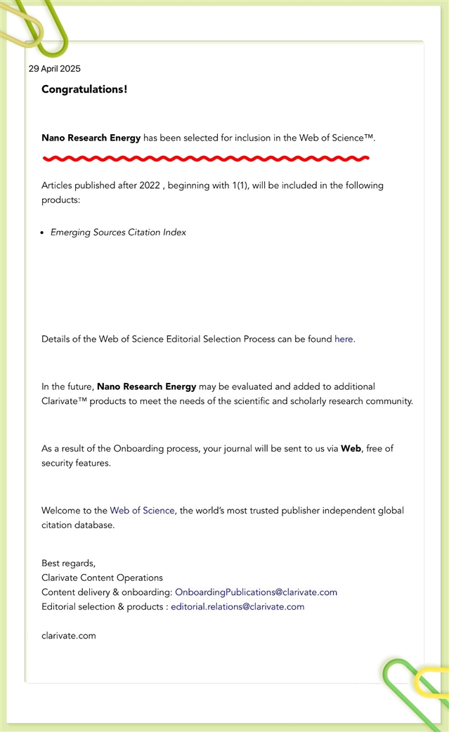 | 喜报 | Nano Research Energy 被ESCI数据库收录! |