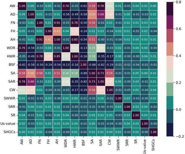 ▲ 图四:形态参数与能源性能的散点图,(a) 外墙面积(AW),(b) 窗户面积(AD),(c) 楼层数量(FN),(d) 建筑高度(FH),(e) 建筑总面积(AH),(f) 窗墙比(WDR),(g) 高宽比(HWR),(h) 建筑体形系数(BSF),(i) 屋顶面积(SA),(j) 屋顶面积比(SAR),(k) 窗墙面积(CW),(l) 南向窗墙比(SWWR),(m) 太阳能得热率(SRR),(n) 太阳能反射率(SR),(o) 外墙传热系数(Us),(p) 窗户太阳得热系数(SHGCs)。©本文作者