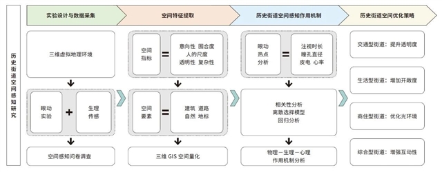• 提出一种基于三维虚拟地理环境的历史街道空间感知研究方法,构建了“物理-生理-心理”研究路径
