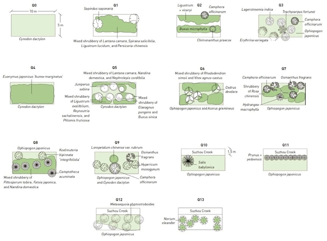 经过预实验,本研究最终在苏州河流域中心城段周边滨河绿地内选取了14个受不同程度交通噪声影响、具有不同植物群落结构的测量样地(Q0~Q13)。样地选择基于以下标准。