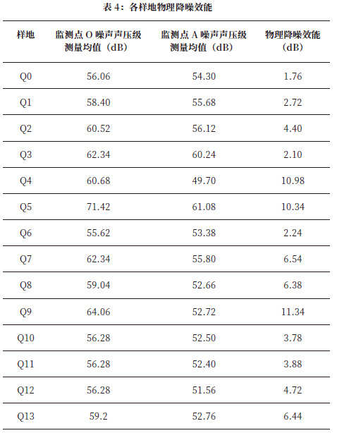14个样地的噪声原点声压级均值、植物降噪后的声压级均值,以及物理降噪效能如表4所示。实测结果显示,所有植物群落样地中Q9最佳;降噪效能最差的是对照组Q0。